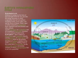 The document discusses Earth's hydrosphere and the water cycle. It explains that energy from the sun drives evaporation from surfaces like oceans, rivers, and soil. This water vapor then condenses to form clouds, which absorb infrared radiation in the atmosphere. Pumping groundwater increases the amount of water in the hydrosphere that is subject to evaporation and transpiration, adding to cloud cover and influencing the climate system, though the exact impacts are still being studied. The total mass of Earth's hydrosphere is about 1.4×1018 tonnes, with about 75% of the surface covered by oceans with an average salinity of 35 grams of salt per kilogram of seawater.