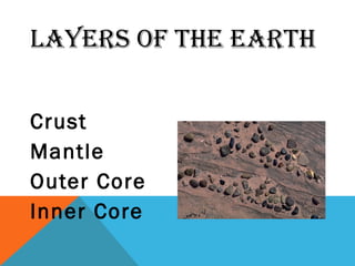 The document describes the four main layers that make up the Earth - the crust, mantle, outer core, and inner core. The crust is the top-most layer where life exists, ranging from 5-25 miles thick. Below is the mantle, a semi-liquid layer 3000 km wide that causes convection currents moving the continents. Deepest are the solid inner core and surrounding liquid outer core, both composed primarily of iron.