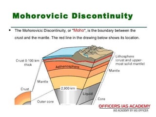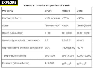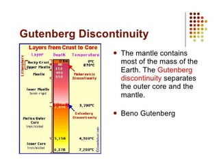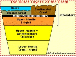 The Earth can be divided into layers based on both mechanical properties and chemical composition. Mechanically, it consists of the lithosphere, asthenosphere, mesospheric mantle, outer core, and inner core. Chemically, it consists of the crust, upper mantle, lower mantle, outer core, and inner core. Seismic discontinuities exist between these layers
