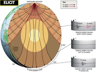 P-waves and S-waves are seismic waves that travel through the Earth. P-waves are compressional waves that push and pull material in the direction of travel, while S-waves are shear waves that cause material to vibrate perpendicular to the direction of travel. Studying these waves provides information about the composition and structure of the Earth's interior.