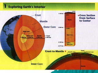 The document summarizes the three main layers of Earth - crust, mantle, and core. The crust is the outermost layer and varies in thickness and composition between oceanic and continental crust. Below the crust is the mantle, the largest layer made of hotter rocks that increase in density with depth. The innermost layer is the core, divided into a liquid outer core that generates Earth's magnetic field and a solid inner core made of iron and nickel.