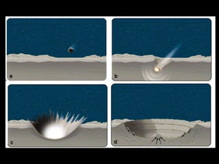 The document provides information about the Moon and its exploration history. It describes the Moon's size and distance from Earth. Key events in lunar exploration included Soviet missions in 1959 and US missions in the 1960s including Rangers, Lunar Orbiters, and Surveyors. The Apollo 11 mission in 1969 was the first to land humans on the Moon. The document discusses lunar geology, noting differences from Earth like the lack of an atmosphere, water, or plate tectonics. It describes lunar features such as maria, highlands, craters, and rilles. The formation of the Moon is also summarized.