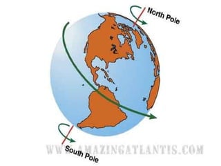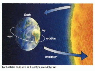 1) Earth spins on its axis once every 24 hours, causing day and night. The side of Earth facing the sun experiences day, while the opposite side experiences night.
