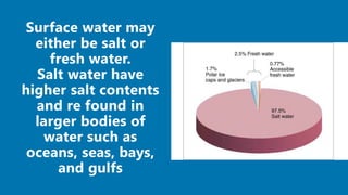 The hydrosphere refers to all water on Earth, including water in the hydrological cycle that circulates between oceans, atmosphere, and land via evaporation, condensation and precipitation. Only a small percentage of 2.5% of Earth's total water is freshwater, with most found as surface water or groundwater stored in aquifers underground between rock and soil particles.