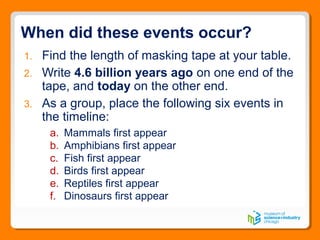 This document provides an overview of Earth's timeline from 4.6 billion years ago to present day. It includes a masking tape representation of the timeline with key events labeled to place in order, such as fish, amphibians, reptiles, dinosaurs, mammals and birds first appearing. Accompanying information discusses banded iron formations, the emergence of prokaryotic and eukaryotic cells, and life moving onto land over Earth's history from the Hadean and Archean eons to the current Phanerozoic eon. Mass extinctions that occurred throughout this period are also noted.