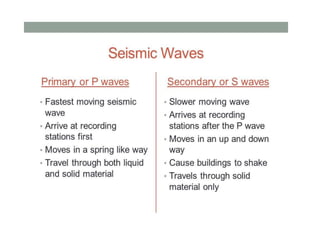 The internal structure of the Earth can be inferred from seismic data and is divided into layers. The crust is the topmost solid layer, varying in thickness and composition between continental and oceanic crust. Below is the mantle, which makes up over 80% of the Earth's volume and is semi-liquid. The mantle is separated from the core by the Mohorovicic discontinuity. The core is the innermost layer and is divided into a solid inner core and liquid outer core, both composed primarily of iron and nickel.