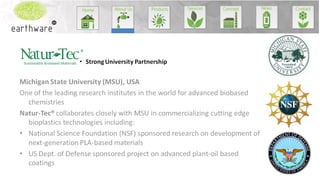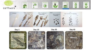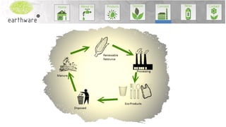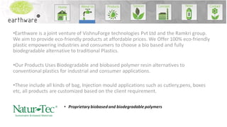 The document discusses the environmental issues caused by plastic bags, highlighting that they take 500 years to degrade, with less than 1% being recycled. It presents a biodegradable alternative made from corn starch, which breaks down into nutrients for microorganisms and reduces carbon emissions significantly compared to traditional plastic bags. The document also details various eco-friendly products and certifications offered by Earthware, promoting solutions to replace conventional plastics.