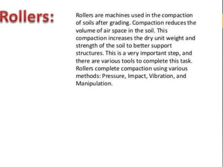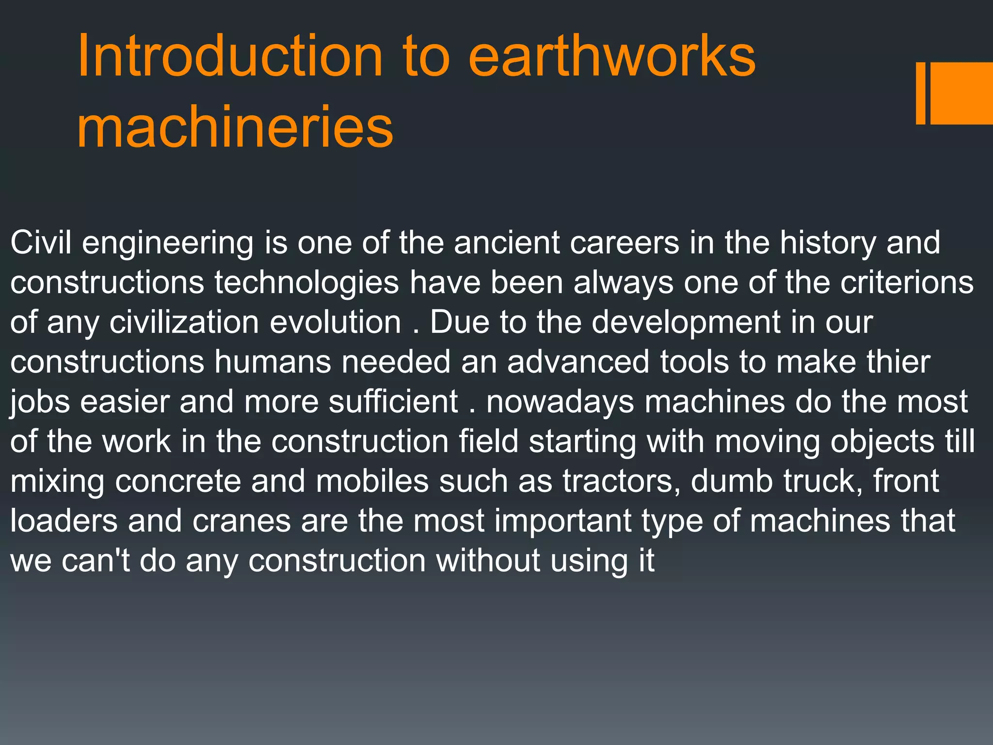 The document discusses the evolution and importance of earthworks machinery in civil engineering, highlighting its role in construction advancements. Key machinery types include tractors, loaders, dumpers, excavators, bulldozers, motor graders, and cranes, each serving specific functions such as moving materials and site preparation. The evolution of these machines has enabled more efficient construction processes, showcasing their indispensable nature in modern civil engineering projects.