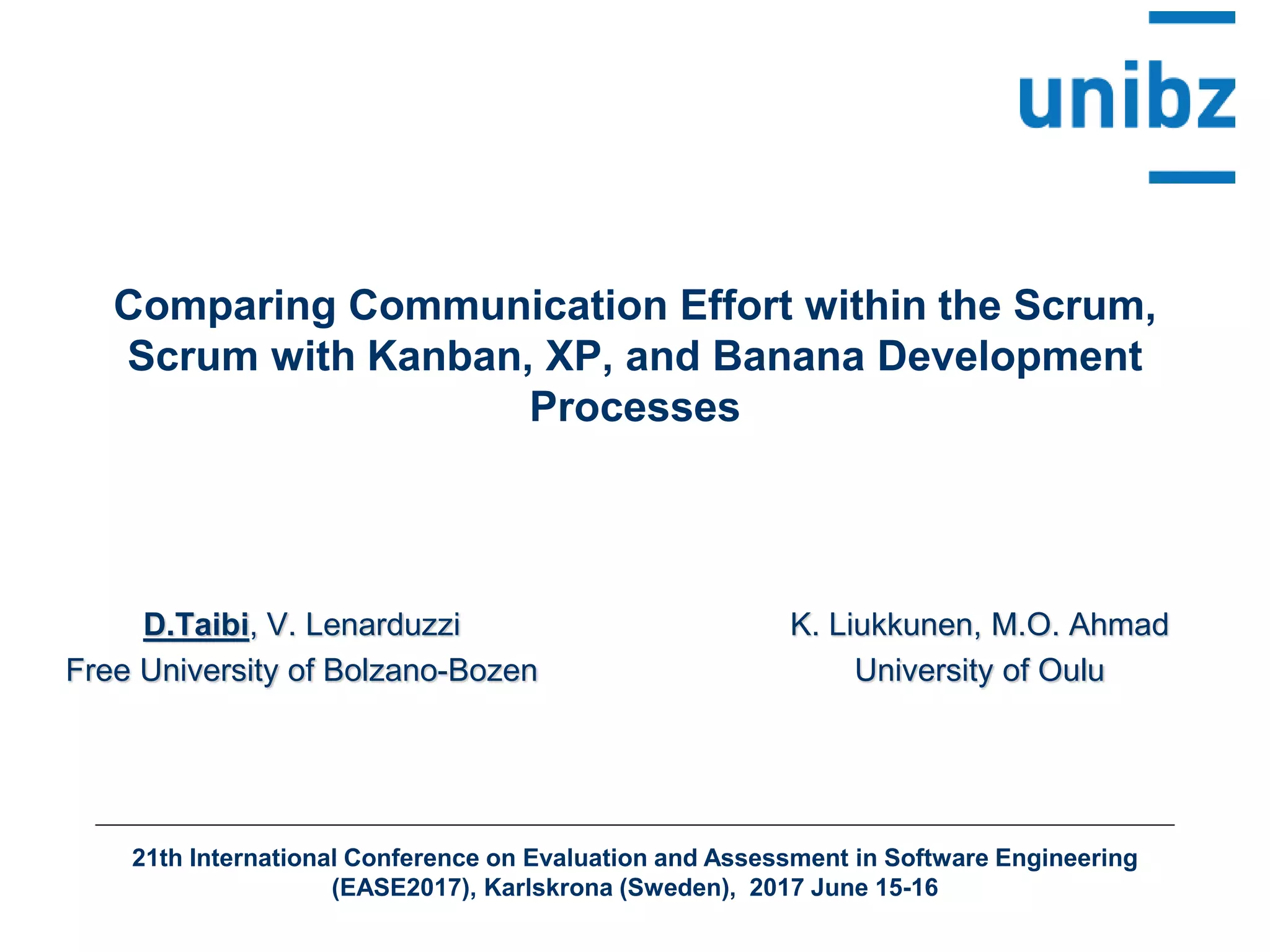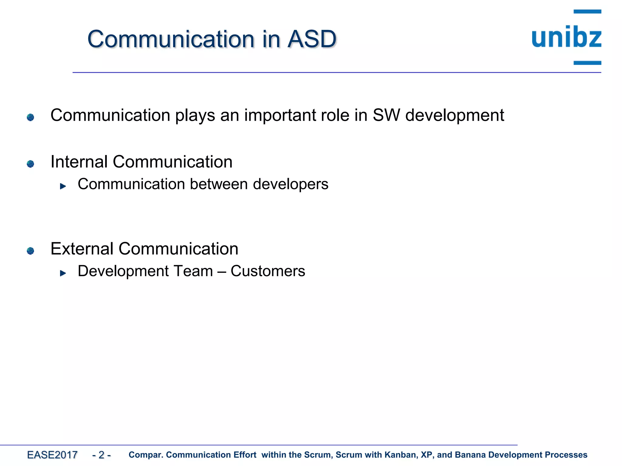 The document analyzes communication efforts within various agile development processes including Scrum, Kanban, XP, and a unique Banana method, focusing on synchronous and asynchronous communication dynamics among developers and customers. Research questions investigate which process requires more communication time and overhead, using a case study involving Android and web applications developed by multiple teams. Findings indicate that while Scrum and Kanban processes delivered projects with less effort, the communication overhead is not significantly influenced by the choice of development process, suggesting communication should be viewed positively in learning environments.
