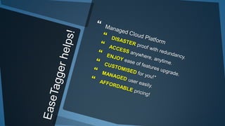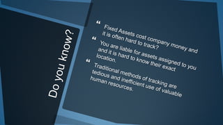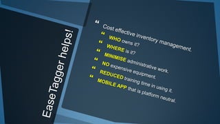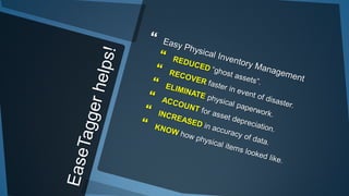 The document outlines a method for creating inventory tag entries using easetagger, detailing steps from item acquisition to service tracking. It includes processes for tagging items with NFC/QR codes, logging information, and managing custodianship and servicing details. The system also facilitates check-in/check-out, service reminders, and asset depreciation tracking.