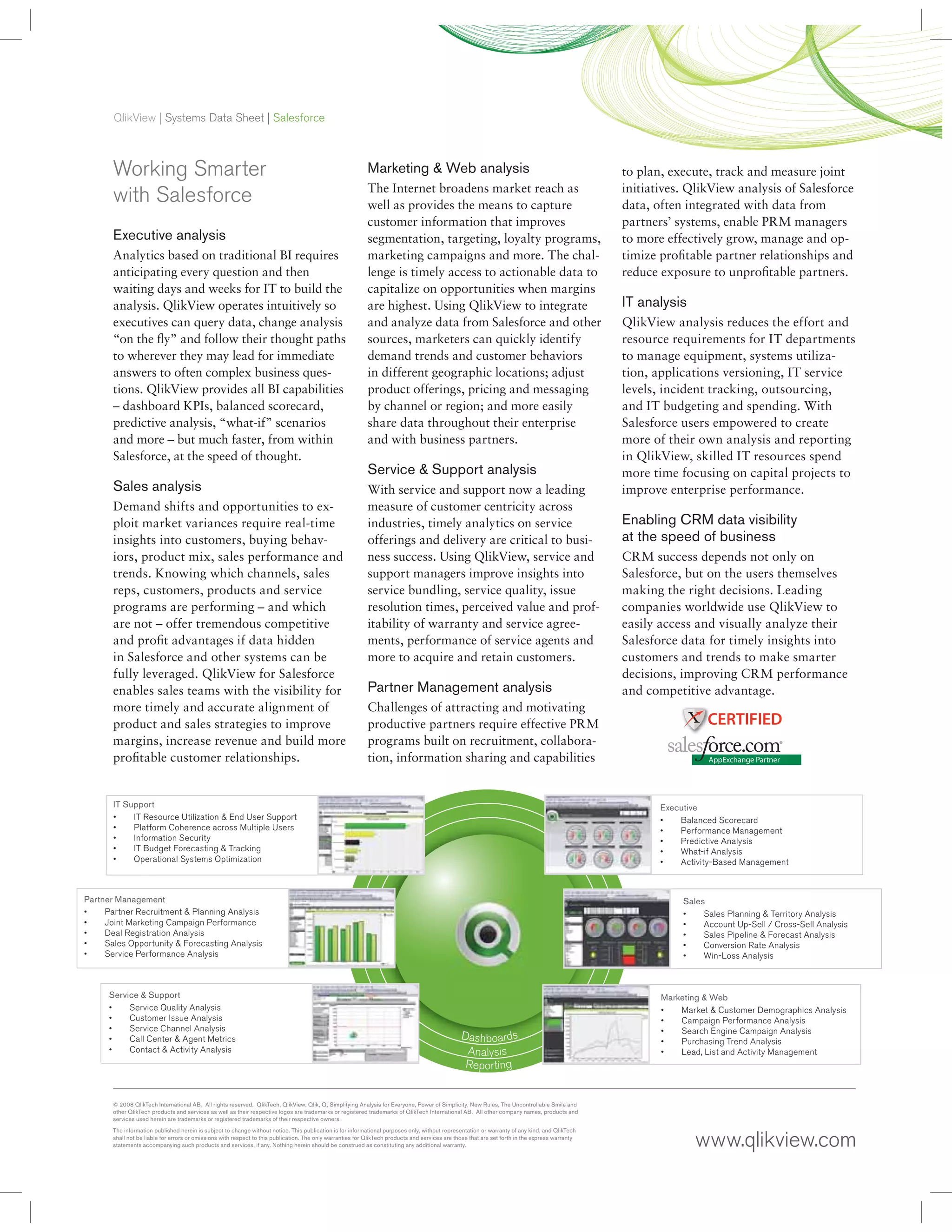 QlikView for Salesforce allows users to easily access and visualize their Salesforce data through custom tabs and embedded charts to gain insights for smarter decision making. It simplifies integrating business intelligence with Salesforce by enabling instant access to CRM data without requiring complex IT projects. The solution empowers sales teams, marketers, managers and other users to query and analyze Salesforce data in real-time for opportunities to improve performance, maximize revenue and better serve customers.