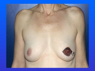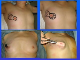 This document discusses level 1 oncoplastic surgery techniques, which are simple breast reshaping principles that can be performed without plastic surgery training. These techniques aim to allow for wider excisions for breast conservation while minimizing cosmetic deformities. They include undermining skin and the nipple-areolar complex, recentralizing the nipple, and using glandular flaps or sutures for immediate reshaping. Level 1 techniques can potentially solve 90% of cases and reduce positive margin and reexcision rates.