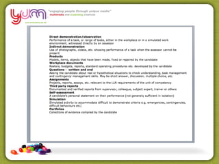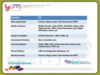 The document discusses the use of digital teaching tools for gathering evidence in blended learning environments, focusing on various assessment methods such as online quizzes, e-portfolios, and case studies. It highlights the importance of integrating multimedia and interactive learning experiences to improve job performance rather than merely sharing information. Additionally, it addresses the challenges educators face in engaging learners and effectively utilizing decision-making trees in assessments.