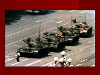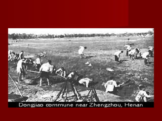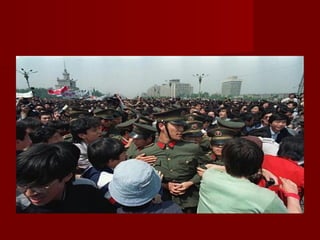 The document summarizes the history of China and East Asia since 1945. It describes how Mao Zedong's communist forces defeated Chiang Kai-shek's nationalists in 1949, establishing the People's Republic of China. It then outlines major events in China including the Great Leap Forward, Cultural Revolution, and Tiananmen Square protests. It also discusses the economic rise of Taiwan, Singapore, South Korea, and Hong Kong in the later 20th century.