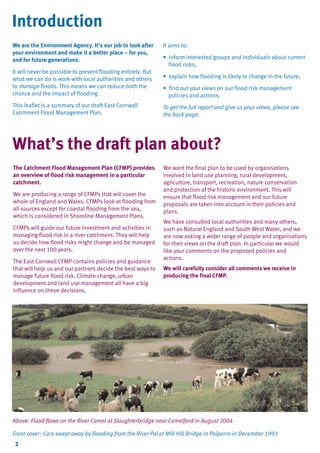 The document is a summary of the East Cornwall Catchment Flood Management Plan (CFMP). It describes the flood risks in the area and sets out policies and actions to manage those risks over the next century. The CFMP divides the catchment into areas with similar flood risk characteristics called policy units. For each unit it identifies one of six policies to reduce, accept, or take advantage of flood risk. The actions proposed include flood storage schemes, maintaining existing flood defenses, surface water management plans, and working with landowners to reduce runoff. The goal is to implement the policies through cooperation with local authorities and other groups.