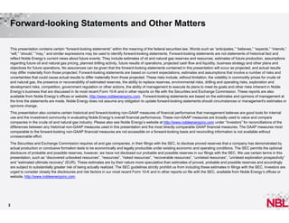 The document discusses Noble Energy's operations and discoveries in the Eastern Mediterranean region, including Israel and Cyprus. It provides resource estimates for fields such as Leviathan (19 Tcf), Tamar (10 Tcf), and Cyprus A-2 (5 Tcf). Demand for natural gas in Israel is growing at 17% annually to 2020 due to power generation, industry, and potential coal plant conversions. Noble is progressing development plans for fields like Leviathan and export opportunities to serve growing regional and LNG markets utilizing over 19 Tcf of identified export volumes.