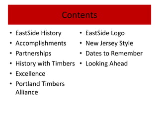 This document provides an overview of Eastside Timbers, formerly known as Eastside United FC. It discusses the club's history, accomplishments, partnerships, logo rebranding, and future plans as part of a new alliance with the Portland Timbers. Key points include a long history of success, partnerships with local recreation departments, a close relationship with the Timbers through staff and player connections, and an emphasis on developing players according to the highest technical, tactical, physical and mental standards as part of the new Timbers alliance.