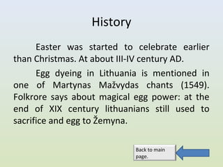Easter traditions and history in Lithuania including: