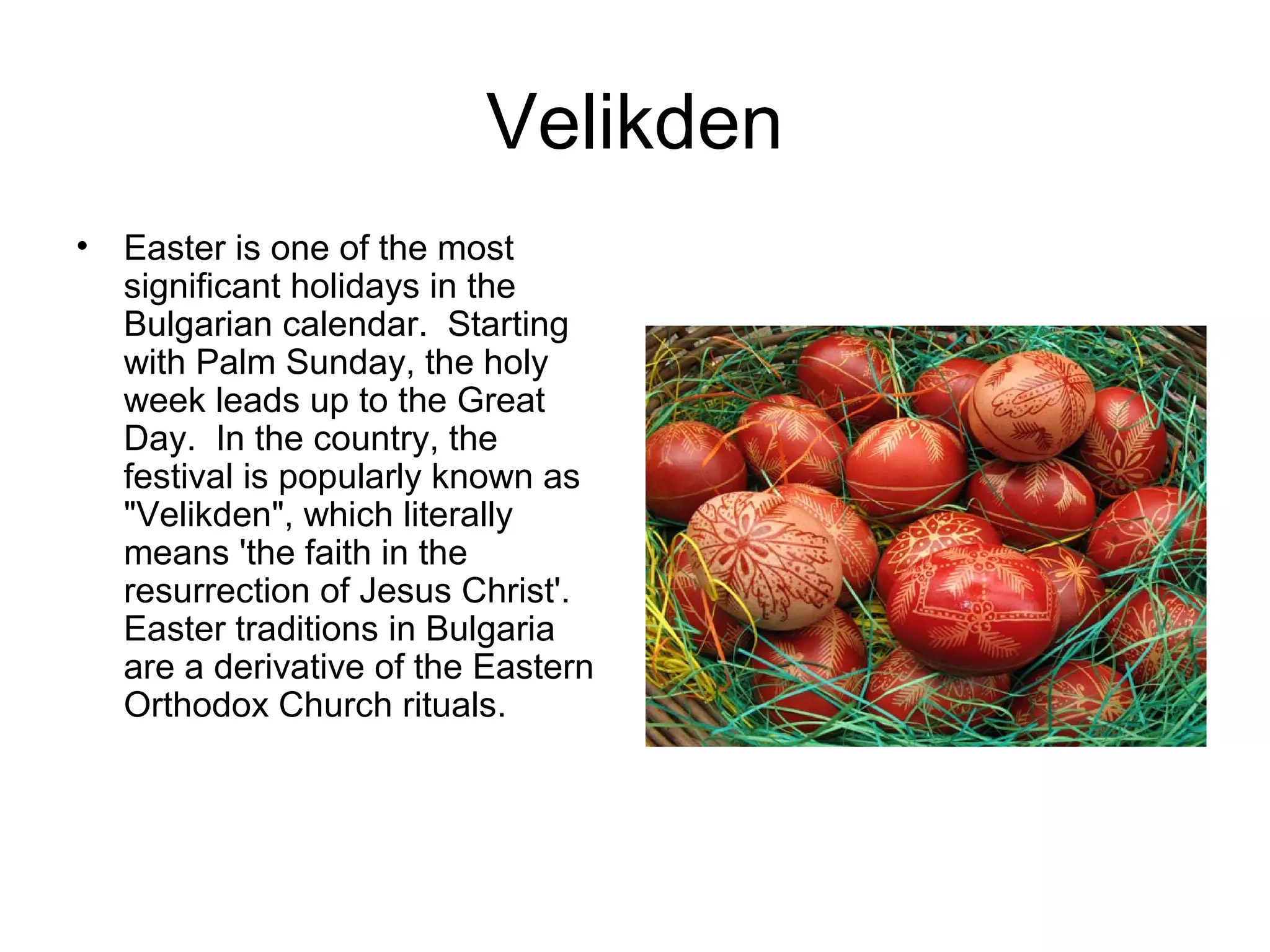 Easter, known as Velikden in Bulgaria, is one of the country's most significant holidays. It is a religious festival celebrated according to Eastern Orthodox Church rituals and traditions, such as attending midnight church services where the priest proclaims Christ's resurrection and parishioners exchange brightly colored eggs and Easter breads like kozunak. Velikden marks the resurrection of Jesus Christ through observances of holy week leading up to the Great Day of Easter Sunday.