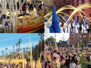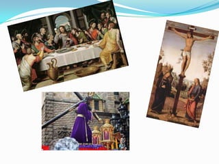 This document provides an overview of key events and traditions associated with Easter and Holy Week. It discusses the meanings and traditions of Palm Sunday, Holy Thursday, Good Friday, Holy Saturday, and Easter Sunday. Key events covered include Jesus' entry into Jerusalem, the Last Supper, Jesus' crucifixion and death, his descent into hell, and resurrection. The document also describes some of the traditions and religious services associated with these days in Catholic and other Christian traditions.