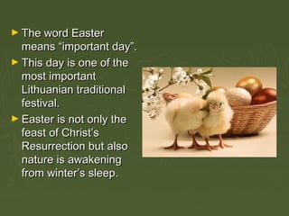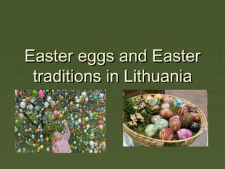 This document discusses Easter traditions in Lithuania. It is one of the most important festivals in the country. People spend six weeks preparing, with rituals starting one week before Easter on Palm Sunday. Traditions include cleaning houses on Holy Thursday, somberness on Good Friday, and obtaining blessed fire and water on Holy Saturday. People also color eggs and prepare meals. On Easter Sunday, there are church processions and services followed by a meal that begins with each person clicking their egg against others'. Children search for eggs left by the Easter Granny and there are games involving eggs such as an egg breaking game and egg rolling down a bark.