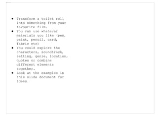 This document provides a challenge for students to transform a toilet roll into something from their favorite film for the Easter holiday. Students can use various materials like paint, pen, pencil, card or fabric to depict characters, soundtrack, setting, genre, location, or quotes from a movie on the toilet roll. Examples shown include representations from The Shining, The Lego Movie, and Paddington to inspire students' creative interpretations.