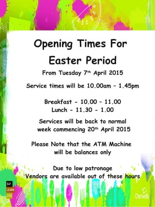 The opening times for Easter period from Tuesday 7th April 2015 are 10:00am to 1:45pm, with breakfast served from 10:00-11:00am and lunch from 11:30am to 1:00pm. Services will return to normal hours the week starting 20th April 2015, and the ATM machine will only offer balances due to low patronage during this period.