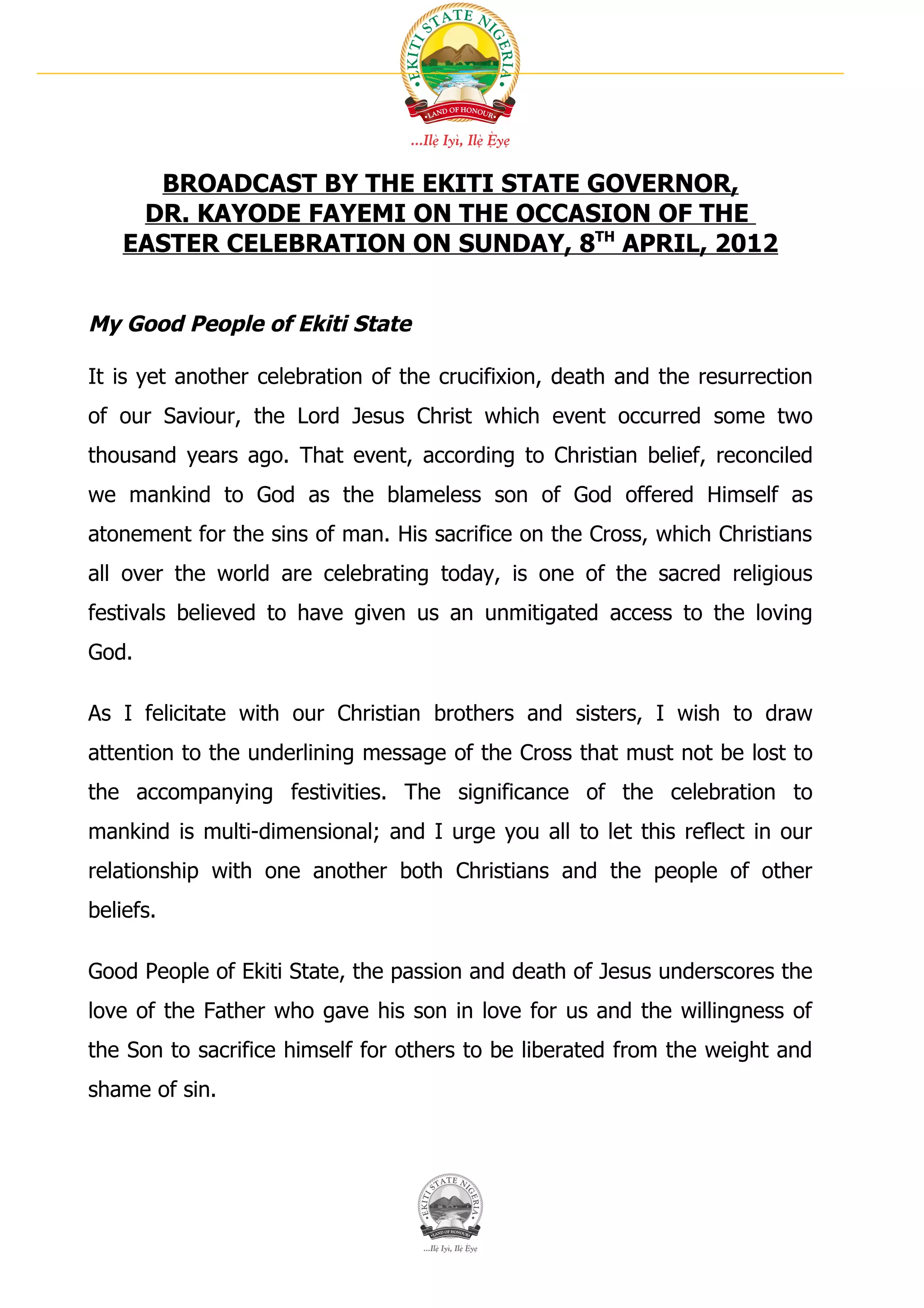 In his Easter broadcast, Ekiti State Governor Dr. Kayode Fayemi emphasizes the significance of Jesus Christ's sacrifice and the need for love, integrity, and accountability in society. He acknowledges the challenges of intolerance and violence in Nigeria while urging citizens to reflect on their faith and promote peace and brotherly love. Fayemi reassures residents of his government's commitment to improving their lives and fostering harmony among all communities.