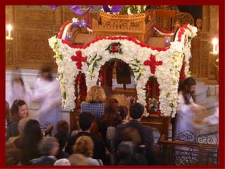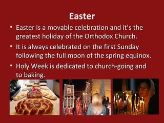 Cypriot Easter traditions include fasting for 50 days before Easter called "Sarakosti" where meat and dairy are avoided. Palm Sunday involves taking palm leaves to church. Flaounes, cheese and herb pastries, are baked on Holy Thursday along with dyeing eggs red. Black veils are put on church icons to mourn Christ's crucifixion on Holy Thursday. Flowers decorate the "Epitafios" or Holy Sepulchre on Good Friday for a procession. People celebrate Christ's resurrection at midnight on Holy Saturday and have an "avgolemoni" soup feast. They crack dyed eggs on Easter Sunday and play traditional games on Monday.