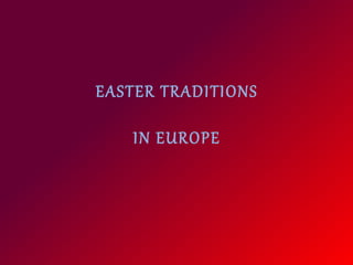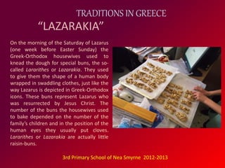This document describes several Easter traditions celebrated in Greece. It discusses the baking of special raisin buns called Lazarakia in Greece to represent Lazarus. It also mentions the palm leaves given out to the faithful on Palm Sunday and the dyeing of eggs on Holy Thursday as symbols of rebirth. Another tradition described is the throwing of large jugs called botithes from balconies in Corfu on Easter Sunday. The document also briefly outlines some Orthodox Holy Friday customs like fasting, avoiding household chores and repairs, and drinking vinegar.