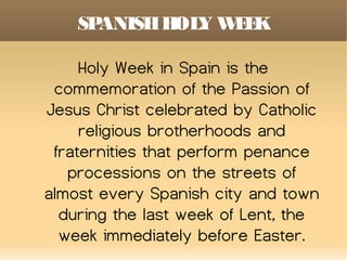 Holy Week in Spain commemorates Jesus Christ's Passion and is celebrated through religious processions performed by Catholic brotherhoods and fraternities in cities and towns. Brotherhoods parade statues of Jesus and the Virgin Mary through the streets accompanied by religious music. Three prominent brotherhoods in one Spanish village are the Jesus Nazarene brotherhood, the Angustias brotherhood, and the Dolores brotherhood.