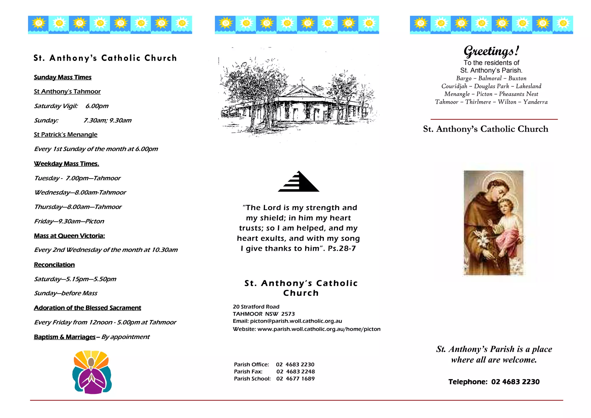 This document provides information about mass times and sacraments at St. Anthony's Catholic Church in Tahmoor, NSW, Australia. It lists the mass times on Saturdays at 6:00pm and Sundays at 7:30am and 9:30am. It also provides the dates and times for Lent, Holy Week, Easter Sunday masses and the sacramental program for 2019, including First Communion in May and Confirmation in August. The parish priest, Father John Ho, invites parishioners to join in worship, especially during Lent, and provides his contact information for anyone needing pastoral care.