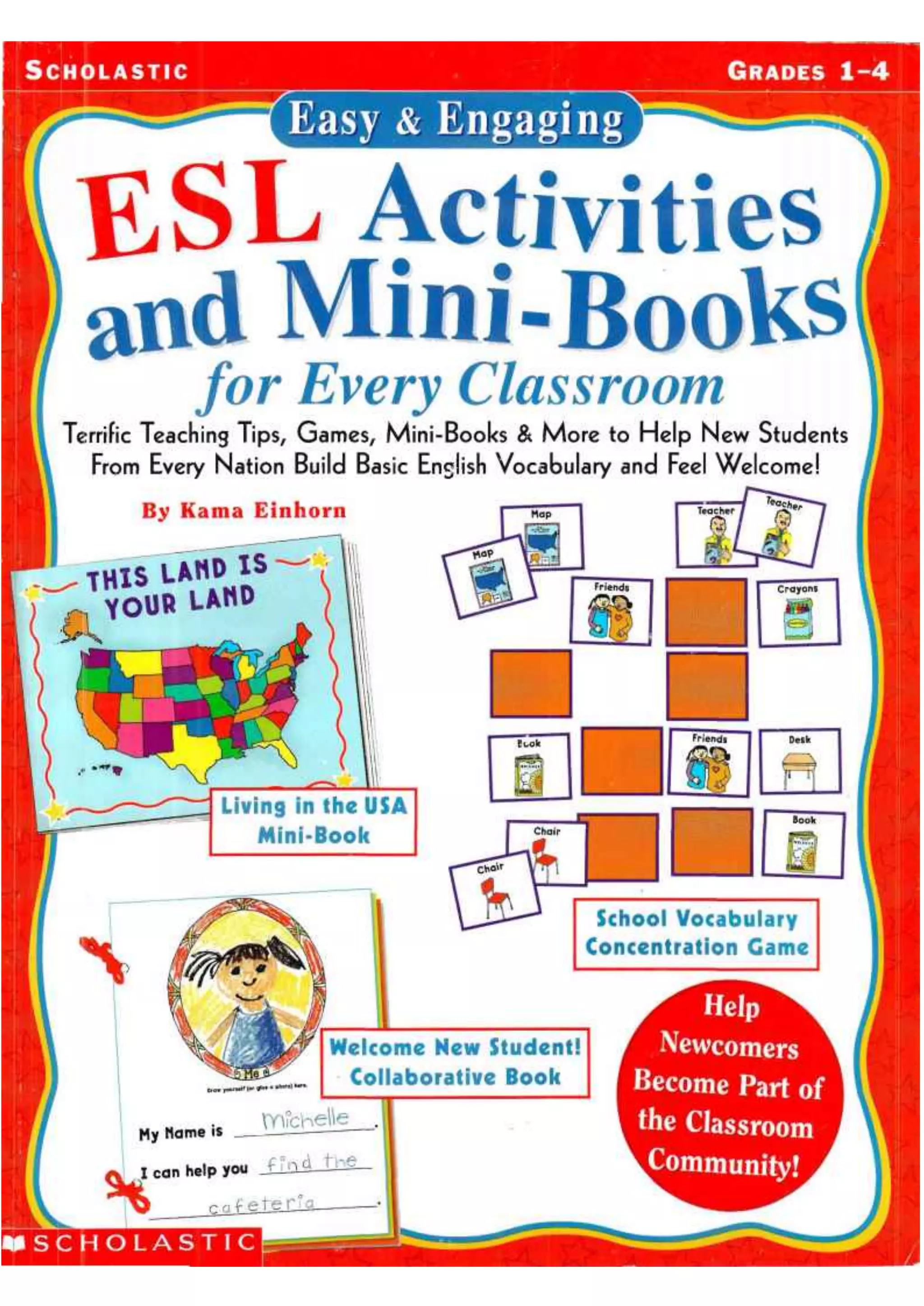 This document provides instructions and materials for teachers to help welcome and support new English language learner students. It includes tips for the first few days with new students such as learning their names, making identification cards, and providing a language reference sheet. A language learning center with books and activities is also suggested to be set up. Assessment of students' language levels and involving their families are addressed. The bulk of the document consists of mini-books, games, art projects and other activities focused on basic vocabulary organized by topic to build students' English skills.