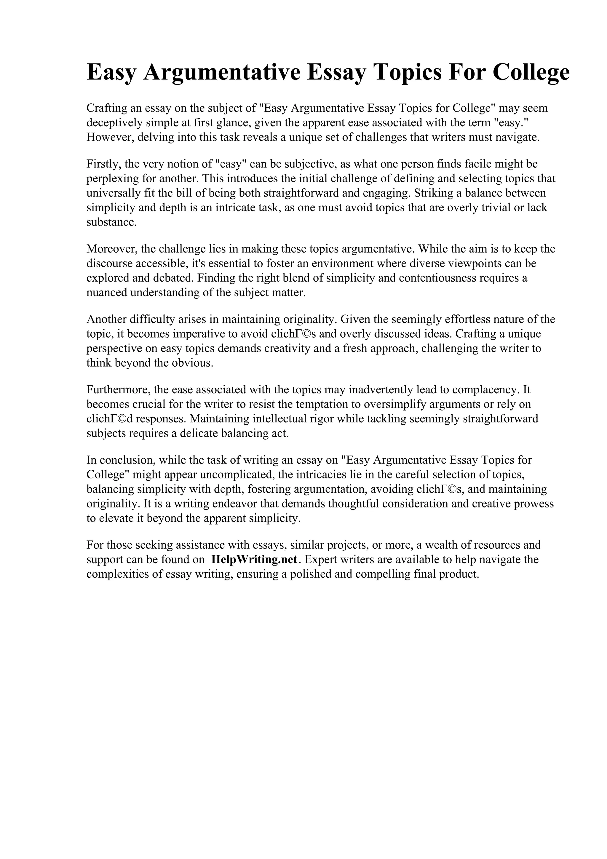 The document discusses the intricate challenges of writing on easy argumentative essay topics for college, highlighting the subjective nature of 'easy' and the need to balance simplicity with depth while fostering engaging discourse. It emphasizes the importance of originality and avoiding clichés, suggesting that a nuanced approach is essential for effectively tackling such topics. Ultimately, the document asserts that despite the perceived ease of the task, it requires thoughtful consideration and creativity to produce a compelling essay.