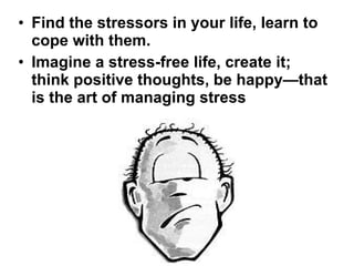 The document discusses various techniques for managing and coping with stress, including deep breathing, positive imagery, progressive muscle relaxation, and laughter. Deep breathing involves taking long, slow breaths to relax the body and reduce tension. Positive imagery uses visualization to imagine relaxing scenarios that reduce stress. Progressive muscle relaxation tenses and relaxes different muscle groups to relieve physical tension. Laughter is also recommended, as spending time with cheerful people and humor can help reduce stress. The document encourages incorporating these techniques into a daily routine to better manage stress.