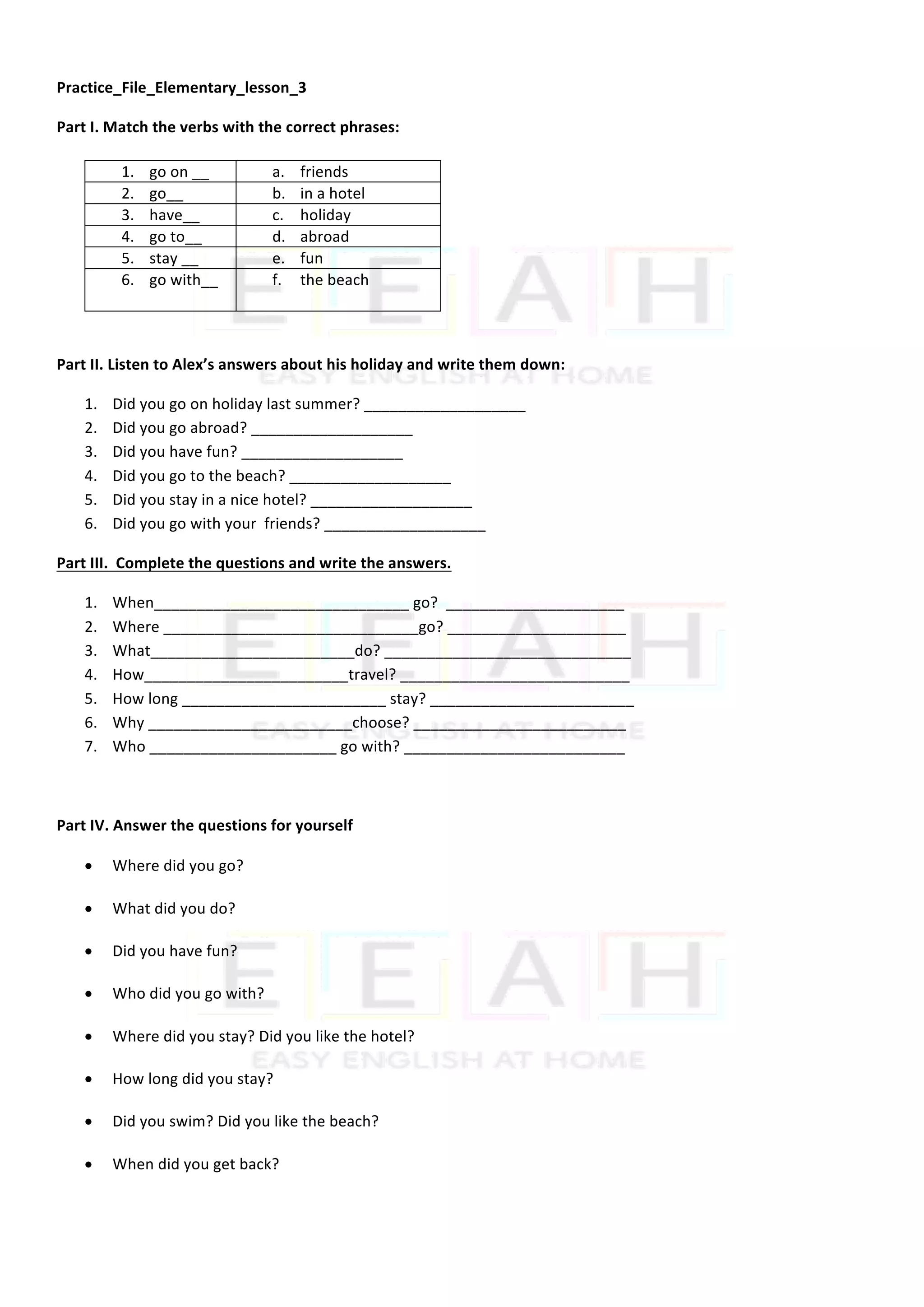 This document contains an elementary English lesson with multiple parts. Part I involves matching verbs to phrases. Part II has questions for a student named Alex about his holiday to answer. Part III gives partial questions for students to complete and answer. Part IV gives additional holiday-related questions for students to answer about themselves. The lesson focuses on practicing vocabulary related to holidays, travel, and common experiences.