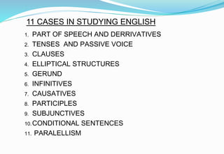 The document provides an overview of 11 cases for studying English including parts of speech, tenses, clauses, and other grammatical structures. It then examines the parts of speech in more detail, defining nouns, pronouns, adjectives, verbs, adverbs, prepositions, and conjunctions. The document also covers tense and voice, defining active and passive forms for the present, past, and future tenses. Examples of converting sentences between active and passive voice are provided.