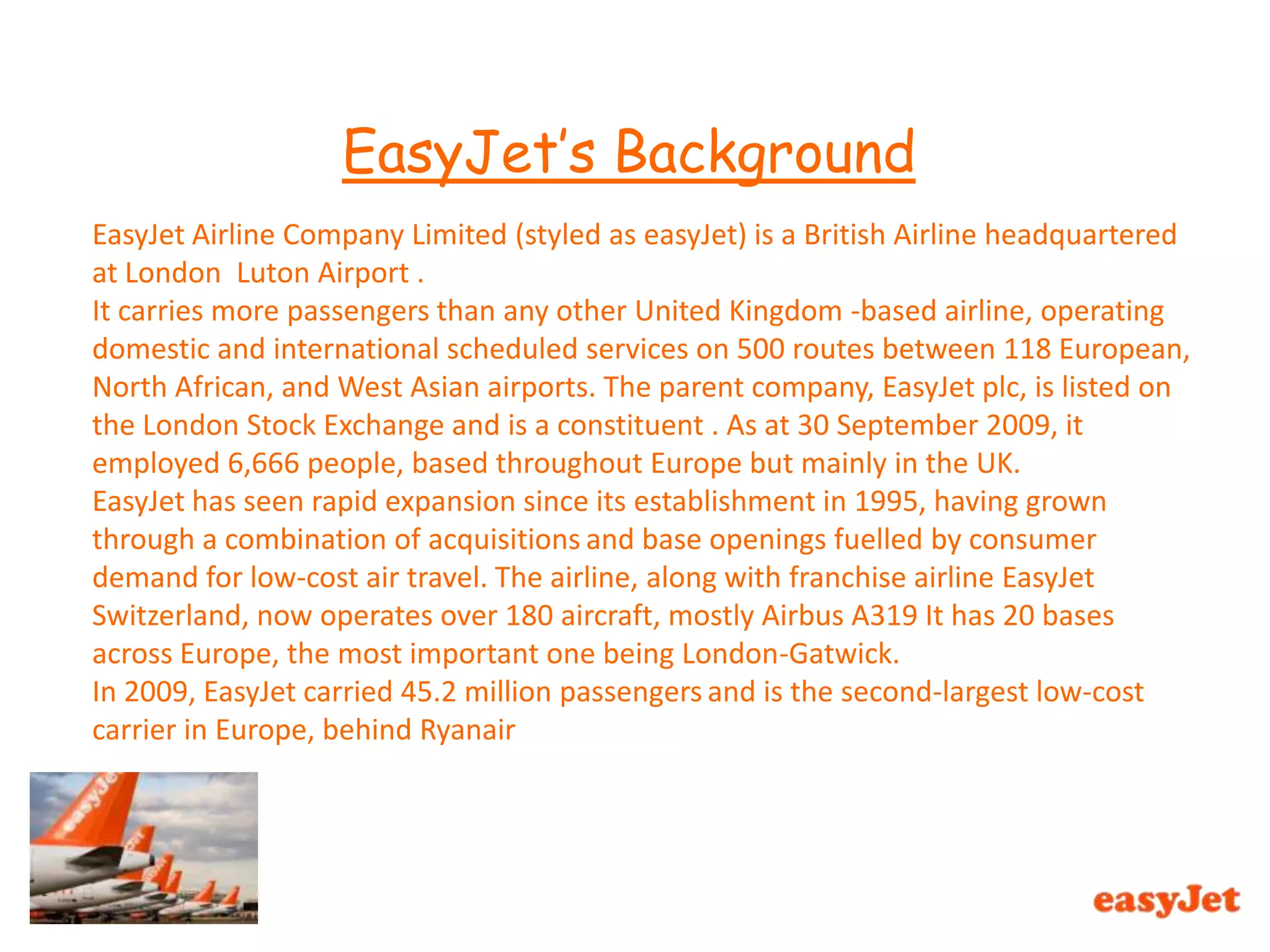 EasyJet is a British airline headquartered in London that carries more passengers than any other UK-based airline. It has seen rapid expansion since 1995 through acquisitions and new routes, and now operates over 180 aircraft across 20 European bases. EasyJet carried over 45 million passengers in 2009 and is the second largest low-cost carrier in Europe behind Ryanair.