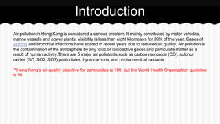 Air pollution is a serious problem in Hong Kong, mainly caused by vehicles, ships, and power plants. Visibility is low for 30% of the year and cases of asthma and bronchitis have increased. The document discusses the major air pollutants in Hong Kong, their effects on health and the economy, as well as things individuals and the government can do to improve air quality.