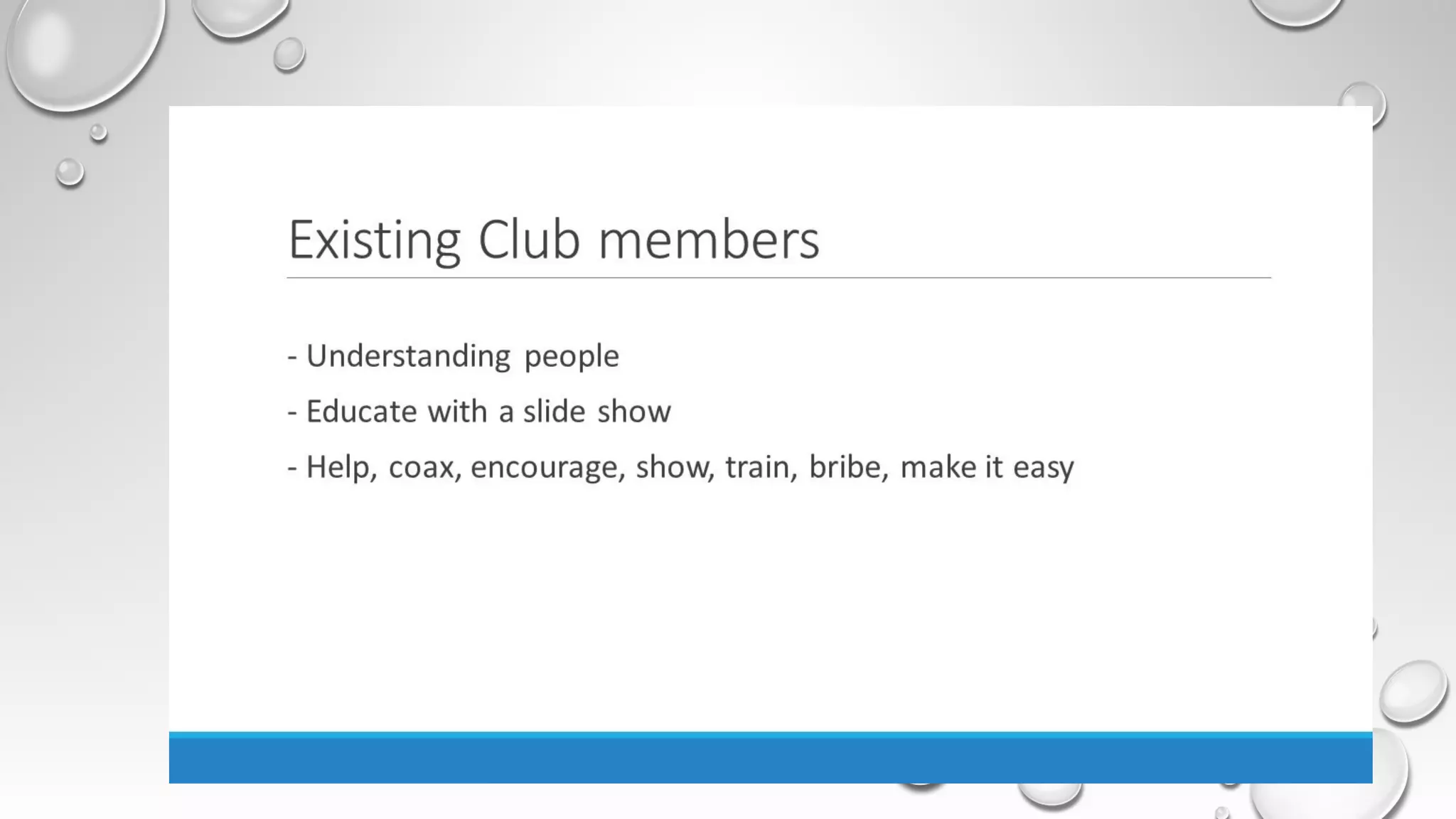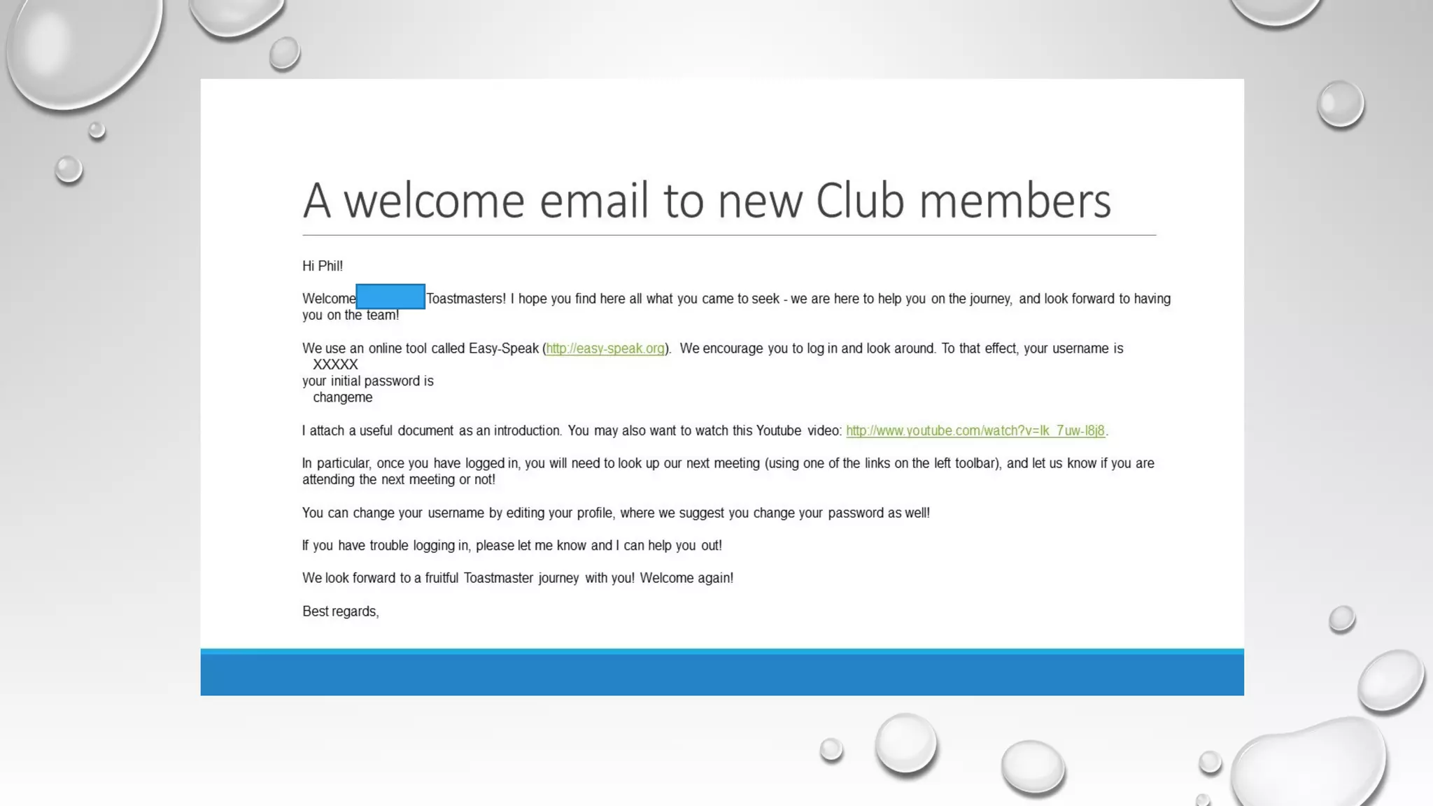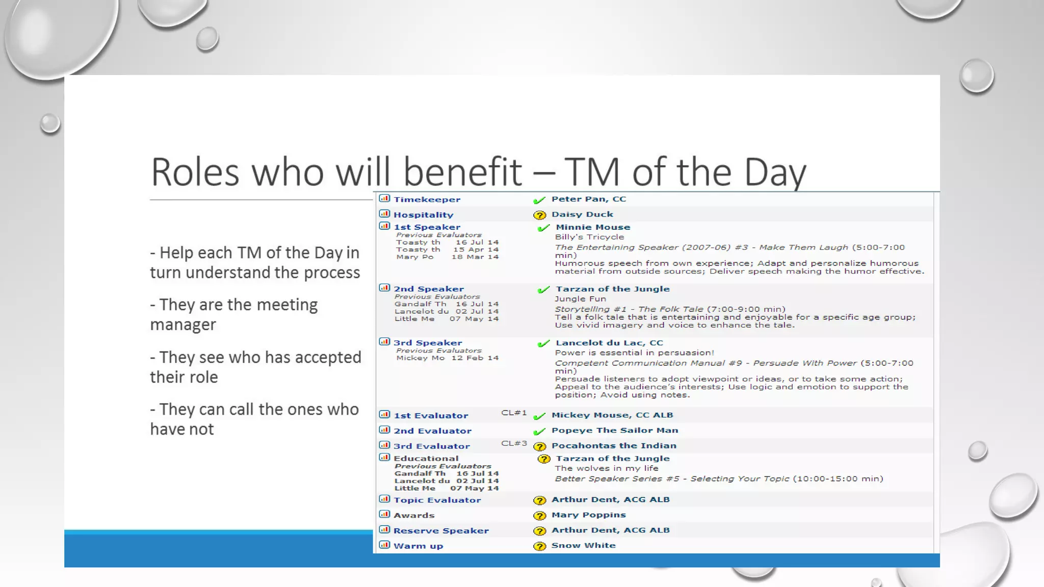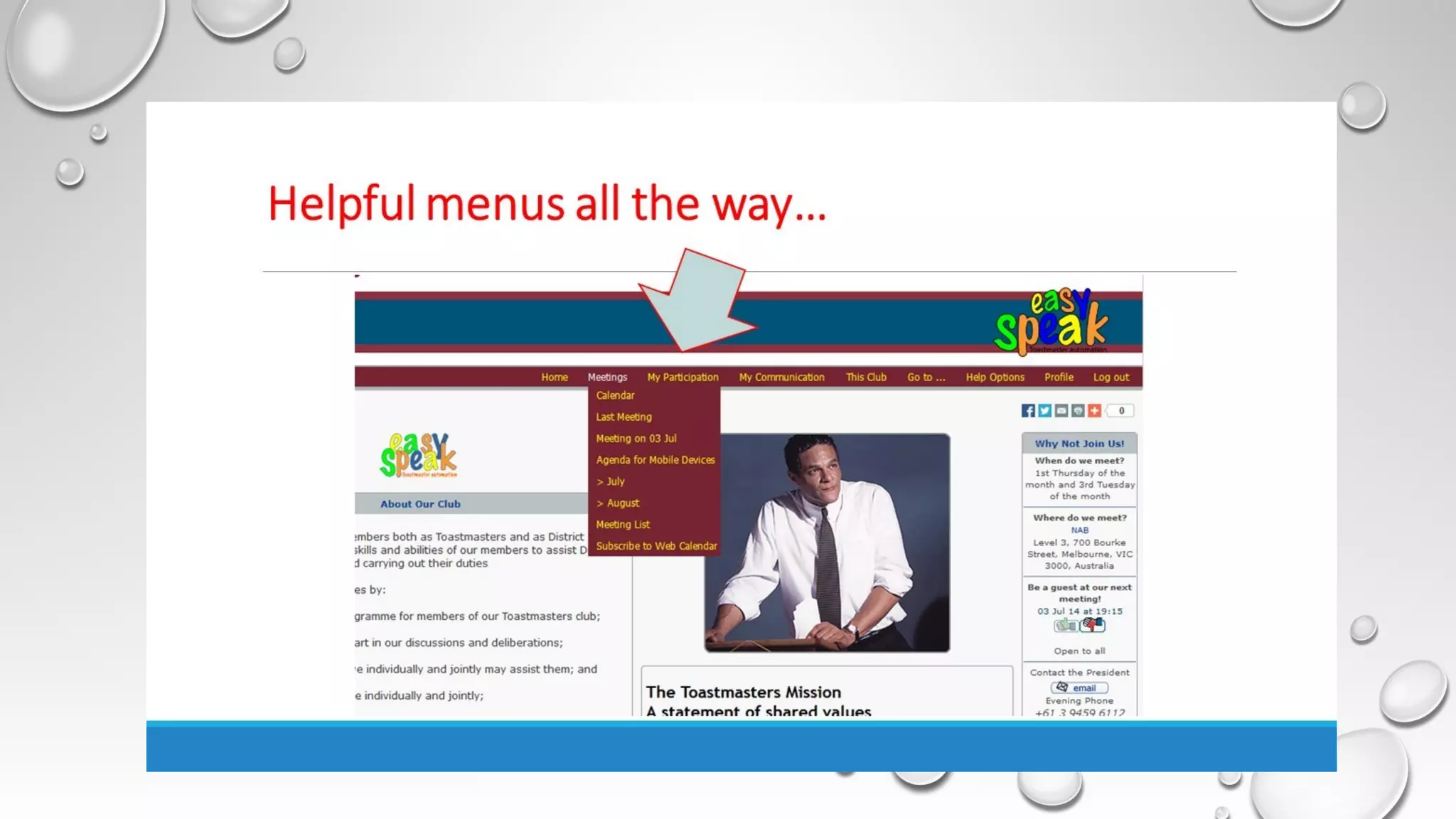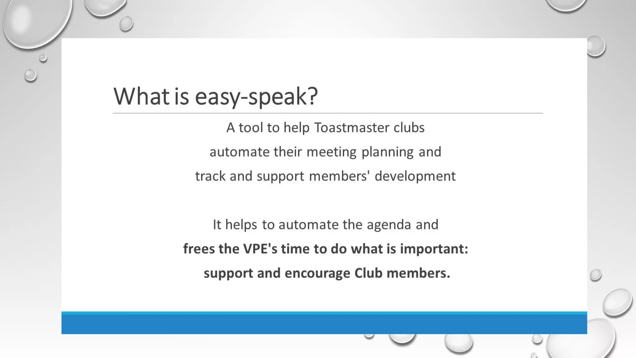 This document provides an agenda for a Toastmasters training on strategies for helping club members. The training will cover bringing new members on board, getting existing members involved, and helping meeting role takers. It will discuss the benefits of Easy-Speak for club officer roles and include a question and answer session. Instructions are also provided on how to login, navigate, and utilize the various Easy-Speak tools and features.