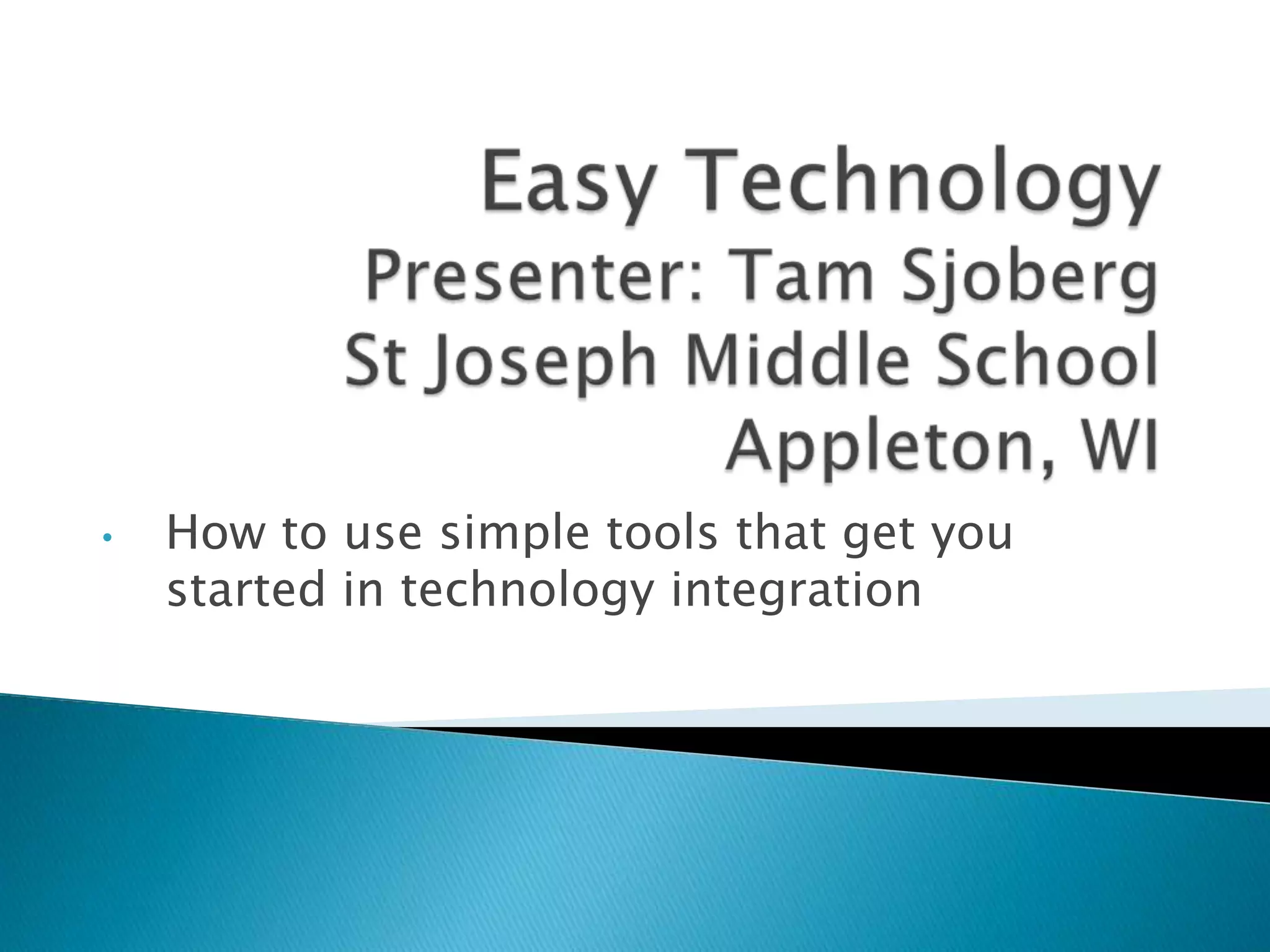 The document discusses how technology integration can engage students by making lessons relevant to their lives and the skills they will need for future jobs. It provides tips for getting started with technology integration, including starting with a few tools and building your repertoire over time. Specific tools discussed include wikis, blogs, videos, websites and surveys. Resources are shared for creating wikis, blogs and surveys, as well as getting more technology integration ideas.