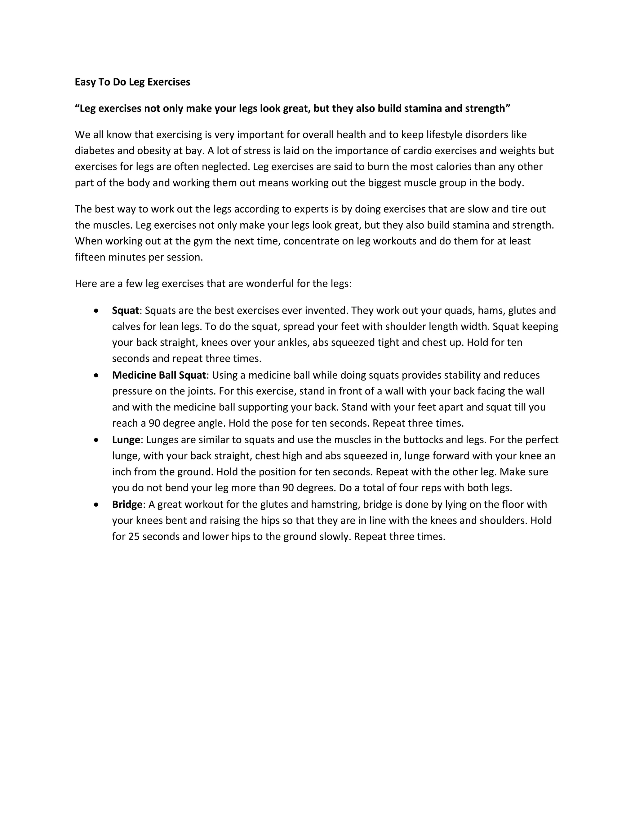 This document discusses the importance of leg exercises for building stamina and strength, highlighting their effectiveness in burning calories and promoting overall health. It details several key exercises such as squats, lunge, and bridge, providing instructions on how to perform each effectively. The document emphasizes dedicating at least fifteen minutes to leg workouts during gym sessions.