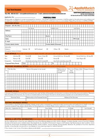 The document is an insurance proposal form from Apollo Munich Health Insurance, outlining the details required for applying for health insurance. It specifies various plan options, medical history inquiries, payment instructions, and general exclusions under the policy. The document also emphasizes the importance of full and accurate disclosure by the proposer to avoid the voiding of the policy.