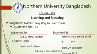 The document discusses verb tenses in English. It explains that verbs are categorized based on time frame (present, past, future) and aspect (indefinite, continuous, perfect, perfect continuous). There are 12 possible tenses that result from combining these categories, such as the present continuous tense and past perfect tense. The document provides definitions and examples of each tense, as well as rules for forming the different tenses.