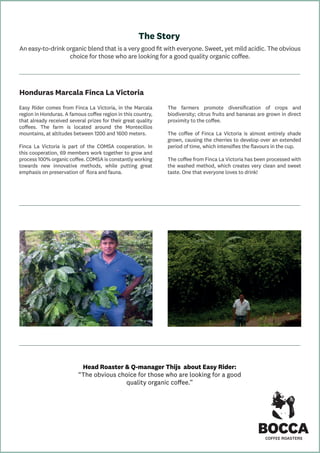 This coffee blend is smooth and brims with sweet notes of chocolate and hazelnut. It comes from Finca La Victoria in Honduras, located at 1200-1600 meters in the volcanic soil of the Marcala region. The farm uses sustainable organic practices like shade-grown trees and crop diversification that intensify the coffee's flavors.