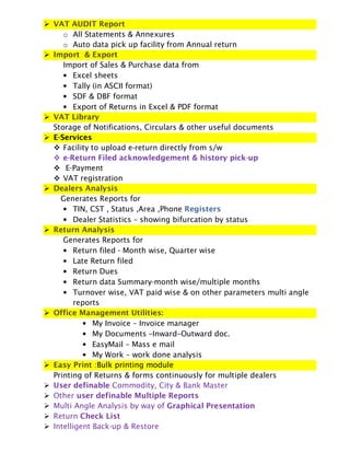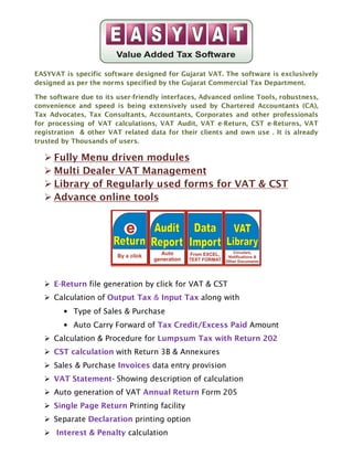 Easyvat is a software specifically designed for managing VAT processes in Gujarat, aligned with the state's commercial tax regulations. It offers user-friendly tools for VAT calculations, audits, e-returns, and registrations, making it popular among tax professionals. The software features multi-dealer management, extensive reporting capabilities, and an e-services facility for efficient tax management.