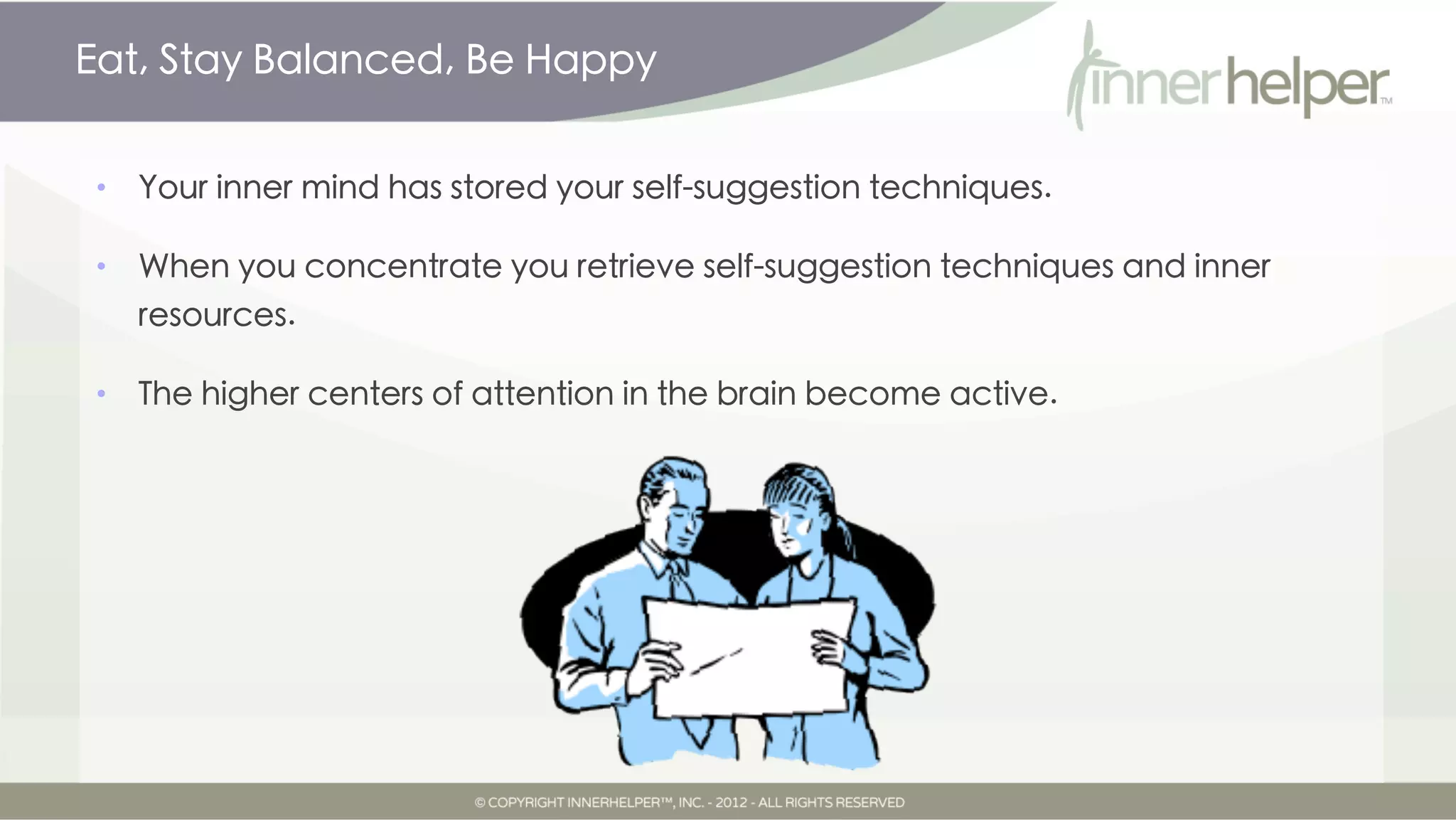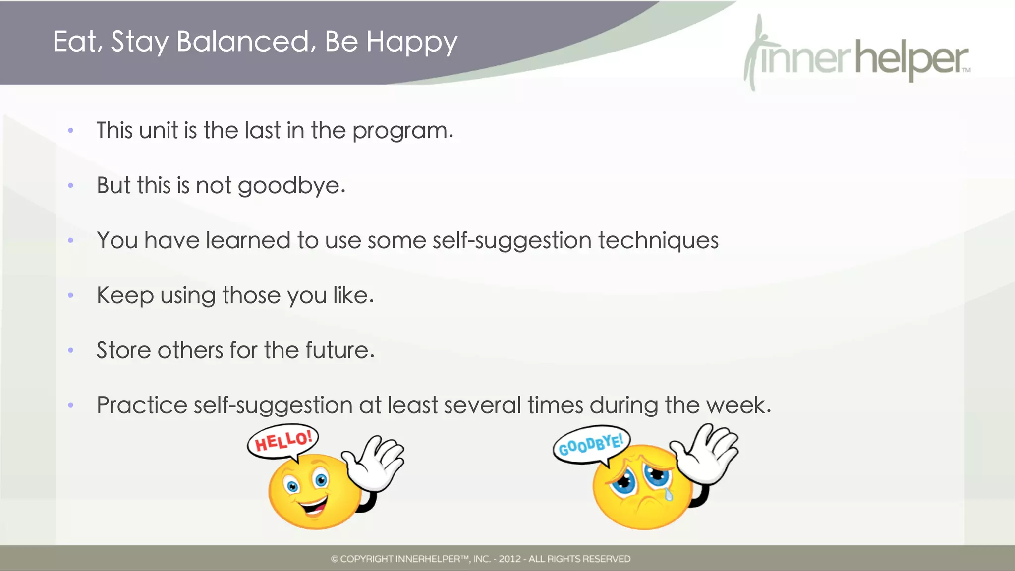 This document provides guidance and techniques for continuing weight management efforts using self-suggestion. It encourages the reader to practice techniques learned from the program regularly, especially in challenging situations involving food. Reviewing lessons, asking for guidance from their "inner helper", and finding an accountability partner can help with long-term success. The overall message is that the reader now has tools to feel in control of their health and weight for life.