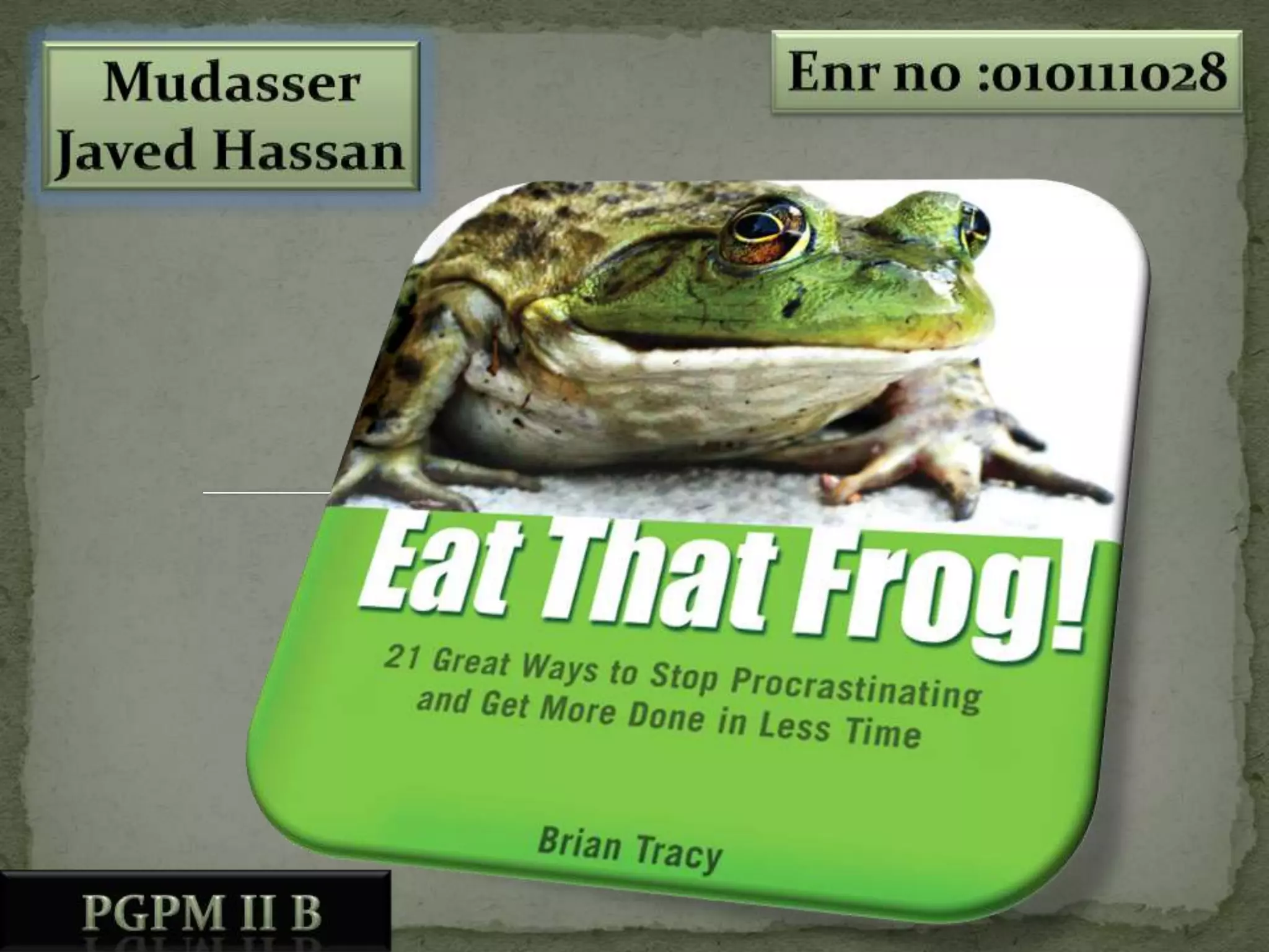 This document summarizes a book about overcoming fears in the corporate world and managing one's time effectively. The author provides 21 tips for stopping procrastination and getting more done faster, including eating the frog (doing the most important task first), setting clear priorities, focusing on key result areas, and practicing urgency. Developing the habit of immediately starting on one's most important task each day is the key to happiness, satisfaction, and success.