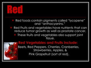 The document discusses the health benefits of fruits and vegetables grouped by color. Red produce contains lycopene and anthocyanins which can reduce cancer growth and support joints. Orange and yellow fruits and vegetables contain carotenoids which convert to vitamin A to support eye and immune health and reduce cancer risk. Green produce contains chlorophyll, lutein, and folate which can lower blood pressure and cholesterol while supporting digestion. Blue and purple foods contain anthocyanins which act as antioxidants and can reduce the risk of heart disease and stroke. White produce contains anthoxanthins which can lower cholesterol and reduce cancer risk.