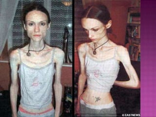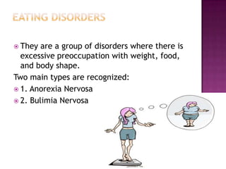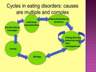 This document discusses eating disorders such as anorexia nervosa and bulimia nervosa. It covers the clinical picture, medical complications, risk factors, comorbidities, prognosis and treatment options. Anorexia is characterized by weight loss and fear of gaining weight while bulimia involves binge eating and compensatory behaviors. Both have higher prevalence in females and can lead to long term medical issues if not properly treated through psychotherapy and medication.